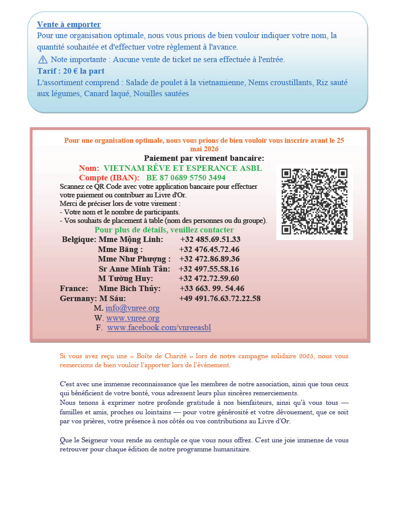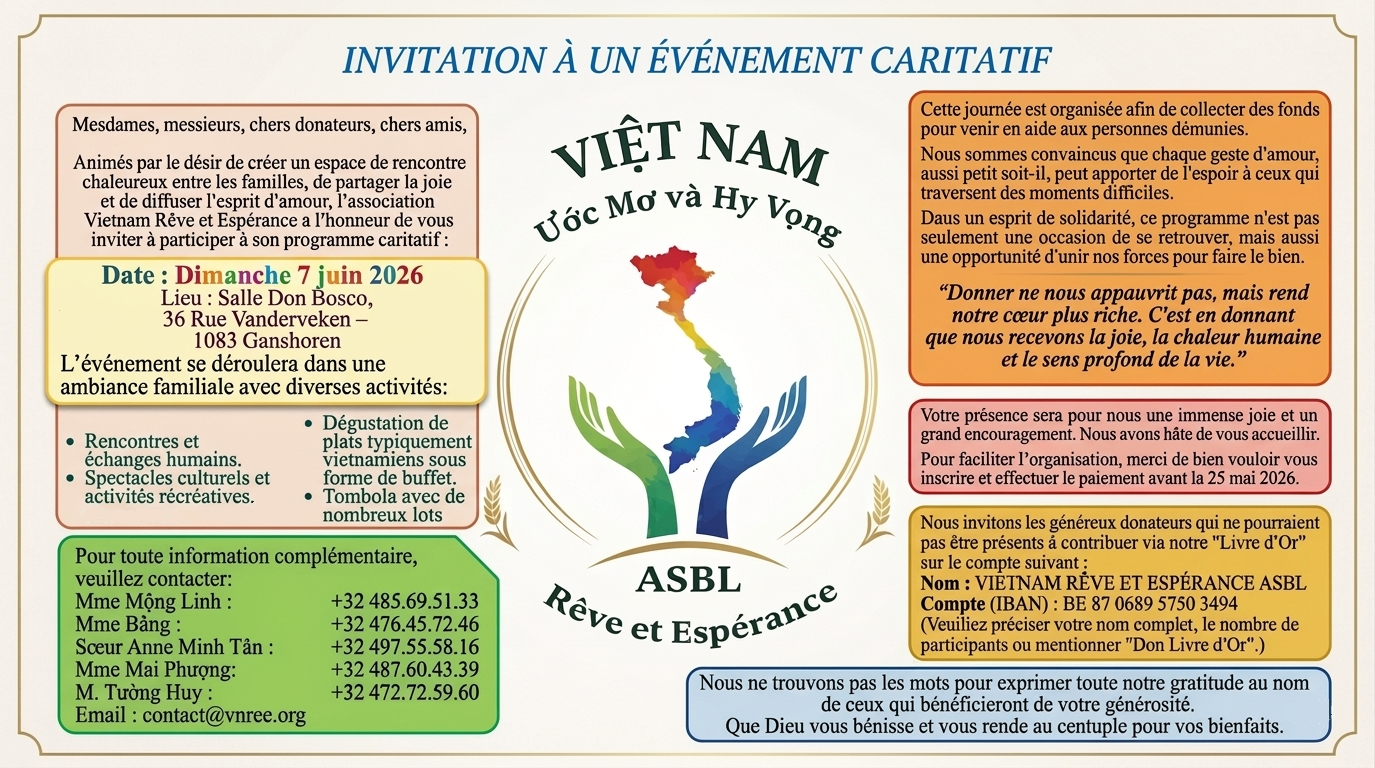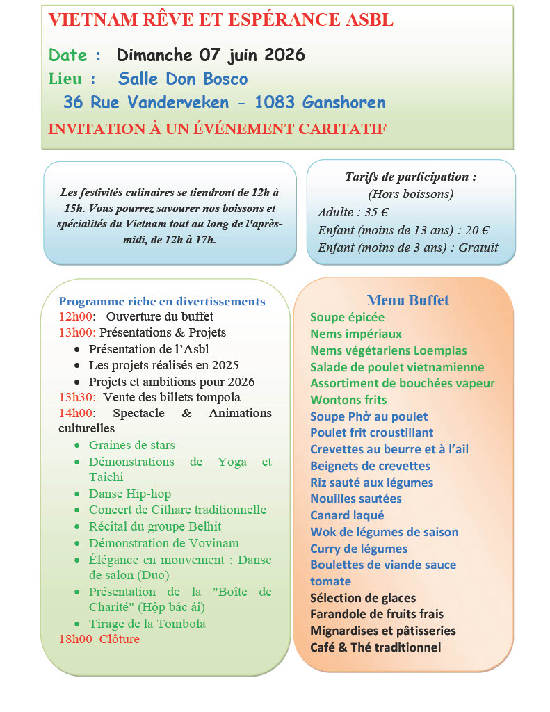 UN GRAND MERCI À MADAME ANNICK POPPE Un pont de solidarité vient de se dresser entre Bruxelles et le Vietnam ! Nous tenons…